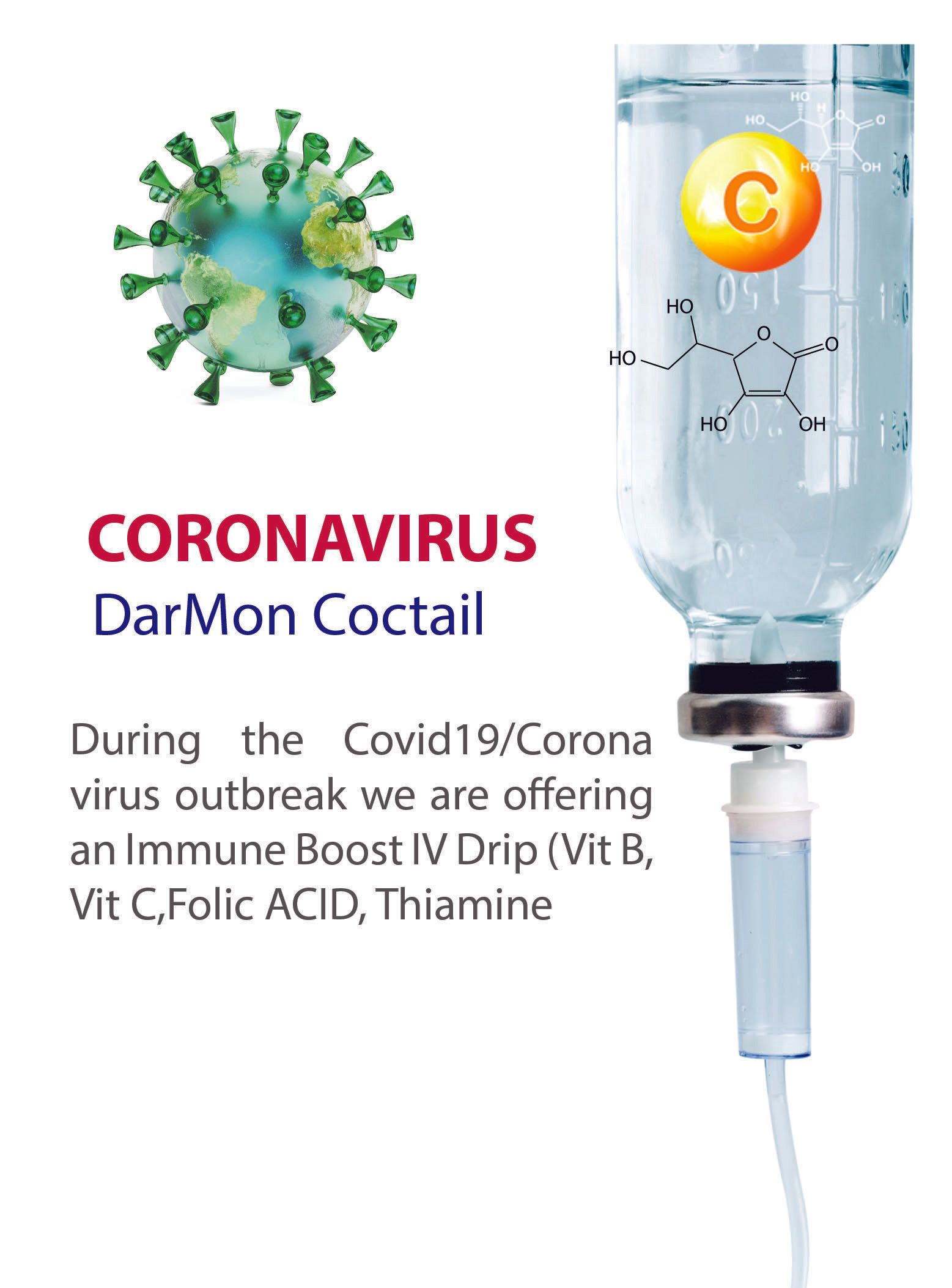 DarMon Cocktail is a medical grade IV treatment to help boost the immune system against infections. This Vitamin cocktail has had multiple randomized clinical trials revealing to lower mortality and decreased hospitalization stay . Major hospitals in the US are using high doses of vitamin C, Thiamine, folic acid and hydrocortisone to support patients in the ICU setting. This has multiple studies indicating improvements in earlier discharge from the ICU.